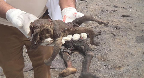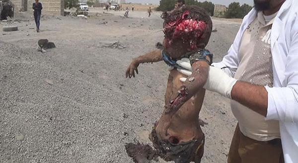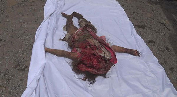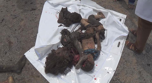 وأظهرت الصور الأولية التي نشرتها قناة المسيرة فظاعة الجريمة بحق النازحين حيث أشلاء الأطفال موزعة في المكان وفي حالة دامية بينها طفلا يبدو رضيعا وهو معروضا على كفين أحدهما.