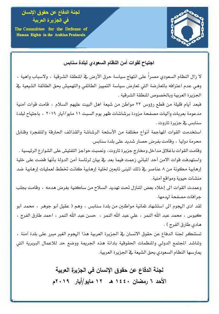 وأضافت اللجنة الحقوقية أنه ’’بعد أيام قليلة من قطع رؤوس 33 مواطنا من شيعة أهل البيت عليهم السلام ، قامت قوات أمنية مدعومة بعربات وآليات مصفحة مزودة برشاشات ظهر يوم السبت 11 مايو/أيار 2019 ، باجتياح لبلدة سنابس في جزيرة تاروت’’ .
