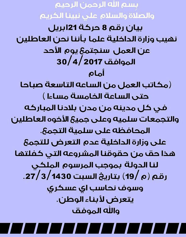 وفي ذلك، أصدرت "حركة 21 أبريل" بيان رقم 8 قالت فيه: نهيب وزارة الداخلية علما بأننا نحن العاطلين عن العمل سنجتمع يوم الأحد الموافق 30 أبريل أمام مكتب العمل من الساعة التاسعة صباحا حتى الساعة الخامسة مساءا في كل مدينة من مدن بلادنا المباركة والتجمعات سلمية".
