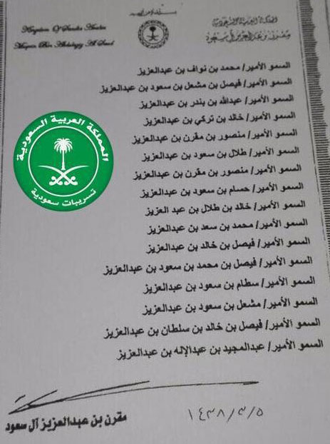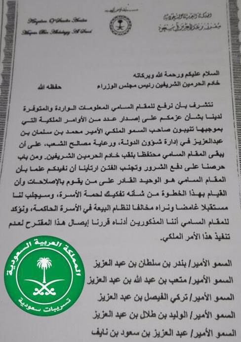 التسريب الجديد، الذي تناقله مغردون على مواقع التواصل الاجتماعي "تويتر"، صدر عن مكتب الأمير مقرن بن عبد العزيز ولي العهد السابق، في ديسمبر السابق، وقع عليه 21 من كبار أمراء الأسرة الحاكمة في المملكة.