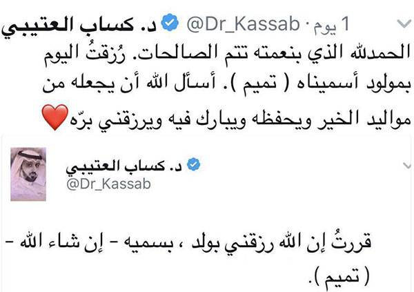 وكتب" العتيبي" في تغريدة أمس الإثنين على موقع "تويتر": "الحمدلله الذي بنعمته تتم الصالحات. رُزقتُ اليوم بمولود أسميناه ( تميم ). أسأل الله أن يجعله من مواليد الخير ويحفظه ويبارك فيه ويرزقني برّه"، مرفقاً ذلك بتغريده سابقة له كان قد أعلن فيها عن نيته بأن إذا رزقه الله ابناً يسميه "تميم".