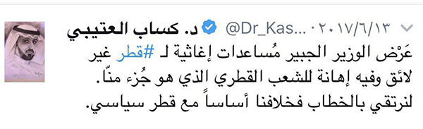 واعتبر " العتيبي" عَرْض وزير الخارجية السعودي عادل الجبير حول إرسال مُساعدات إغاثية لقطر بأنه "غير لائق وفيه إهانة للشعب القطري الذي هو جُزء منّا". وقال: "لنرتقي بالخطاب فخلافنا أساساً مع قطر سياسي".