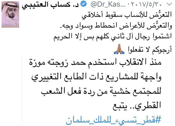 كما دان تعرض الصحيفة الاقتصادية إلى عرض الشيخة موزة بنت ناصر المسند، زوجة أمير دولة قطر السابق الشيخ حمد بن خليفة آل ثاني ووالدة الأمير الحالي الشيخ تميم بن حمد بن خليفة آل ثان، قائلا: "التعرُّض للأنساب سقوط أخلاقي والتعرُّض للأعراض انحطاط وسواد وجه. اشتموا رجال آل ثاني كلهم بس إلا الحريم أرجوكم لا تفعلوا".
