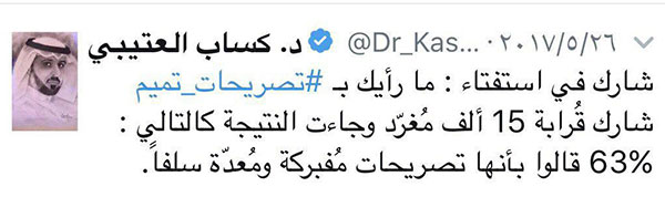 وكان " العتيبي" قد أطلق استفتاء حول مدى مصداقية تصريحات "تميم" التي اتخذتها المملكة السعودية والإمارات ومصر والبحرين حجة في قطع العلاقات مع قطر، كاشفاً أن الاستفتاء شارك فيها قُرابة 15 ألف مُغرّد وجاءت النتيجة كالتالي : 63% قالوا بأنها تصريحات مُفبركة ومُعدّة سلفاً.