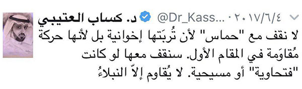 وعمدت "خبير" إلى رصد مجموعة من تغريدات " العتيبي" حول موقفه من الحصار المفروض على قطر من قبل دول المقاطعة حيث أظهرت المنشورات مواقف متذبذبة بين التأييد للقرار السعودي الرسمي لقطع العلاقات مع القطر فيما كان منتقدا لتعاطي الإعلام السعودي وبعض المسؤولين مع الأزمة، وأما الموقف الأقوى له فكان رفضه للقرار السعودي بوصف "حماس" بأنها حركة "إرهابية".
