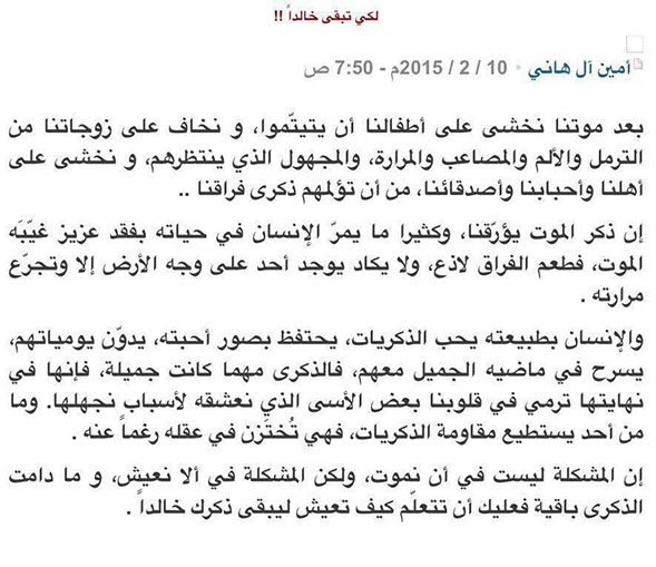 ما أن تأكد خبر شهادته اليوم الأربعاء وذلك بعد خمسة أيام على جريمة اغتياله برصاص القوات السعودية حتى ضجت مواقع التواصل الاجتماعي حيث نعى نشطاء شهيد القرآن ’’أمين آل هاني’’ مستنكرين عملية اغتياله والاستهتار بأرواح الأبرياء والمدنيين من قبل السلطات السعودية.