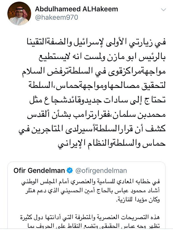 وفي إشارة لتأييده، عمد الحكيم إلى إعادة نشر تقرير القناة العبرية عبر حسابه الخاص بـ ’’تويتر’’، وزاد على أقوال محمد بن سلمان، مطالباً السلطة الفلسطينية بالموافقة على قرار الرئيس الأمريكي دونالد ترامب باعتباره القدس عاصمة لكيان الاحتلال الإسرائيلي، زاعما أن إنهاء معاناة الشعب الفلسطيني أثمن من مساحة أرض، معتبرا أن للسعودية الحق بتحقيق مصالحها بالسلام مع كيان الاحتلال.