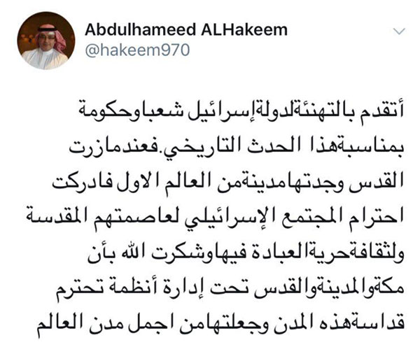 وفي هذه الأثناء غرد الحكيم في حسابه بموقع "تويتر" قائلا:"أتقدم بالتهنئة (لدولة إسرائيل) شعبا وحكومة بمناسبة هذا الحدث التاريخي"، ممجدا كيان الاحتلال. وتابع: "فعندما زرت القدس وجدتها مدينة من العالم الاول فأدركت احترام المجتمع الإسرائيلي لعاصمتهم المقدسة ولثقافة حرية العبادة فيها وشكرت الله بأن مكة والمدينة والقدس تحت إدارة أنظمة تحترم قداسةهذه المدن وجعلتها من أجمل مدن العالم"، على حد زعمه.