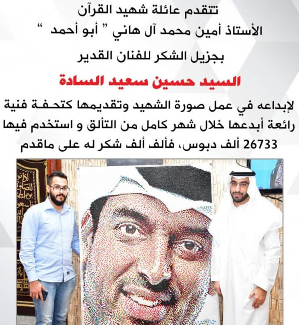 تقدمت عائلة شهيد القرآن الأستاذ "أمين محمد آل هاني" بالشكر والثناء  إلى الفنان السيد حسين سعيد السادة، لإبداعه في عمل صورة للشهيد، وتقديمها كتحفة فنية مستخدما فيها 26733دبوسا.