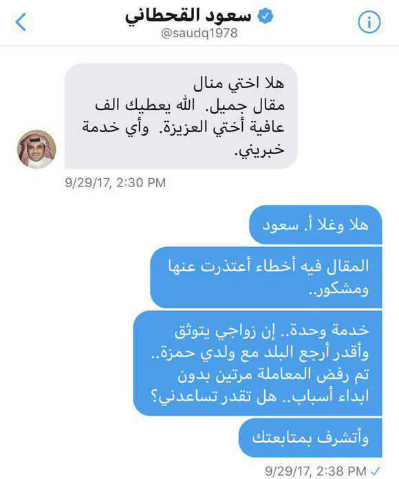 ونشرت الشريف على تويتر محادثات بينها وبين سعود القحطاني المستشار السابق بالديوان الملكي السعودي، في سبتمبر/أيلول من العام الماضي.