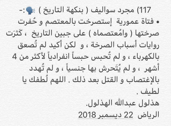 وكتب "هذلول الهذلول" في تغريدة على "تويتر"، أن "فتاة عمورية استصرخت ومعتصماه وحفرت صرختها على جبين التاريخ، وكثرت روايات أسباب الصراخ، ولكن الأكيد لم تصعق بالكهرباء، ولم تحبس حبسا انفراديا لأكثر من 4 أشهر، ولم يتحرش بها جنسيا، ولم تهدد بالاغتصاب والقتل بعد ذلك"، بحسب تعبيره.