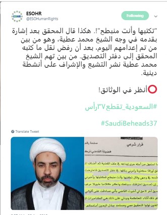 وفي تغريدة أخرى قالت: "تكتبها وأنت منبطح"!. هكذا قال المحقق بعد إشارة بقدمه في وجه الشيخ محمد عطية، وهو من بين من تم إعدامهم اليوم، بعد أن رفض نقل ما كتبه المحقق إلى دفتر التصديق. من بين تهم الشيخ محمد عطية نشر التشيع والإشراف على أنشطة دينية.