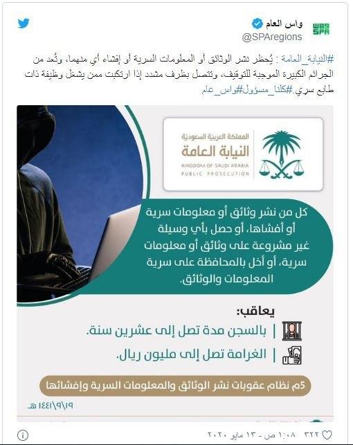 وقالت النيابة: "يعاقب كل من نشر وثائق أو معلومات سرية أو أفشاها أو حصل عليها بأي وسيلة غير مشروعة أو أخل بالمحافظة على سرية المعلومات والوثائق بالسجن مدة تصل إلى 20 عاما وغرامة تصل إلى مليون ريال".