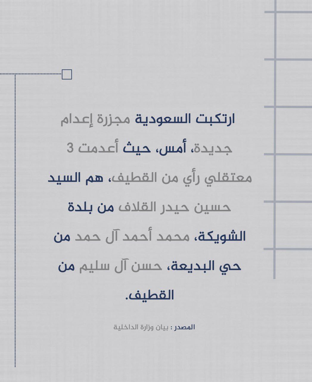 #متداول: النظام السعودي يقتل 3 معتقلي رأي من القطيف