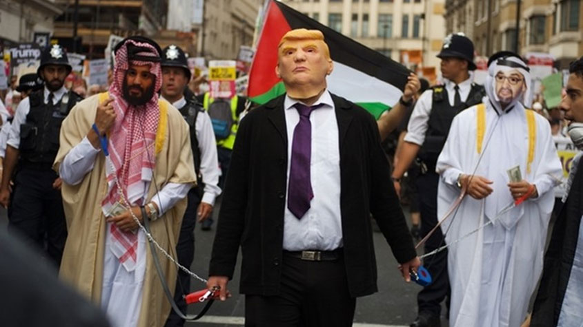 ’’بن سلمان’’ و’’بن زايد’’ مكبلان بالسلاسل خلف ’’ترامب’’ في مظاهرة احتجاجية بـ#لندن
