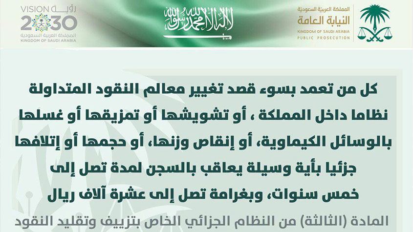 النيابة العامة: السجن 5 سنوات وغرامة مالية لكل من يشوه النقود #السعودية
