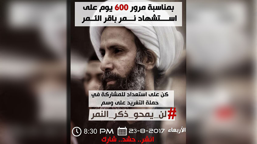 نشطاء يطلقون حملة ’’ #لن_يمحو_ذكر_النمر’’ بمناسبة مرور 600 يوم على شهادة الشيخ الشهيد النمر