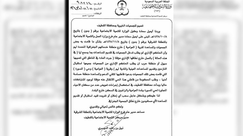 وزارة الشؤون الاجتماعية تمنع جمعيات #القطيف من تقديم المساعدة للنازحين من #العوامية