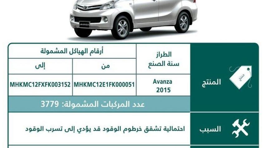 استدعاء 3779 مركبة «افانزا» لاحتمالية تشقق خرطوم الوقود