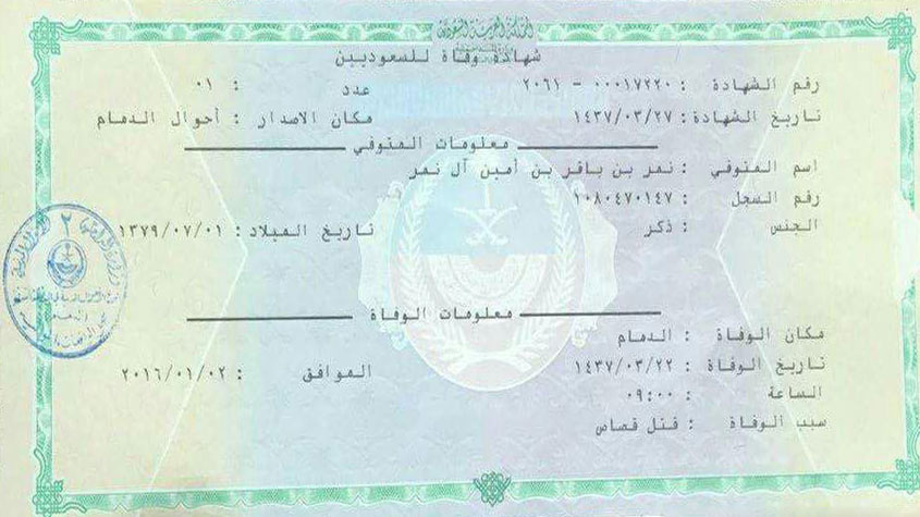 السلطات #السعودية تسلم عائلة #الشيخ_الشهيد_النمر ’شهادة وفاة’ بعد مرور 100 يوماً